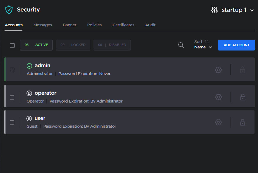 ), and Password Expiry status for each account. From here you can lock, unlock or delete an account, as well as re-enable a disabled account.To view or modify user account details (including the Username, Role, Password, and Public Keys) click the Settings icon
