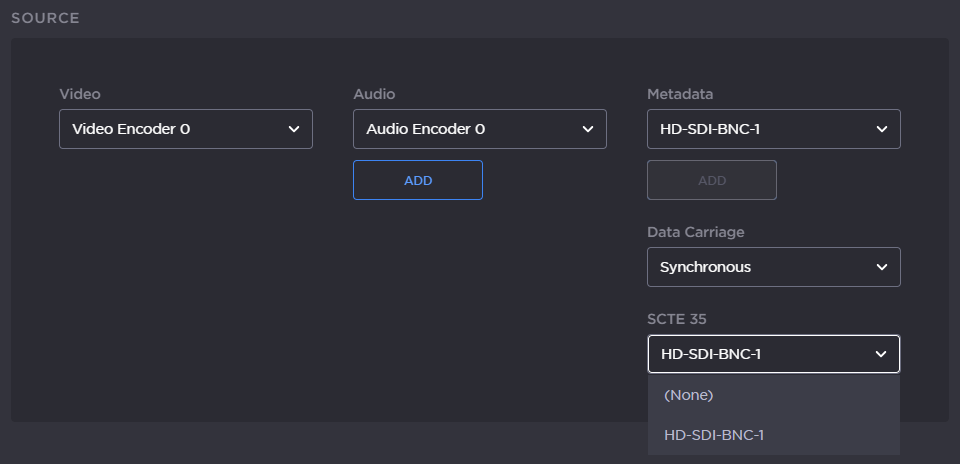 To enable ad insertion, select the available SDI input from the SCTE 35 drop-down menu, as in the following example: For information on setting up ad insertion sources, see Configuring Ad Insertion Sources and adinsertion.