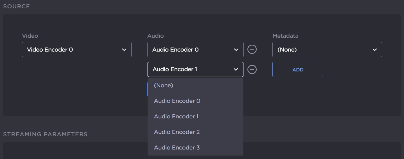 To configure multi-track audio, click the Add button under the Audio field and select the next Audio Encoder to add to the stream. To remove one or more Audio Encoder from the stream, click the Remove icon next to the Audio Encoder field(s).