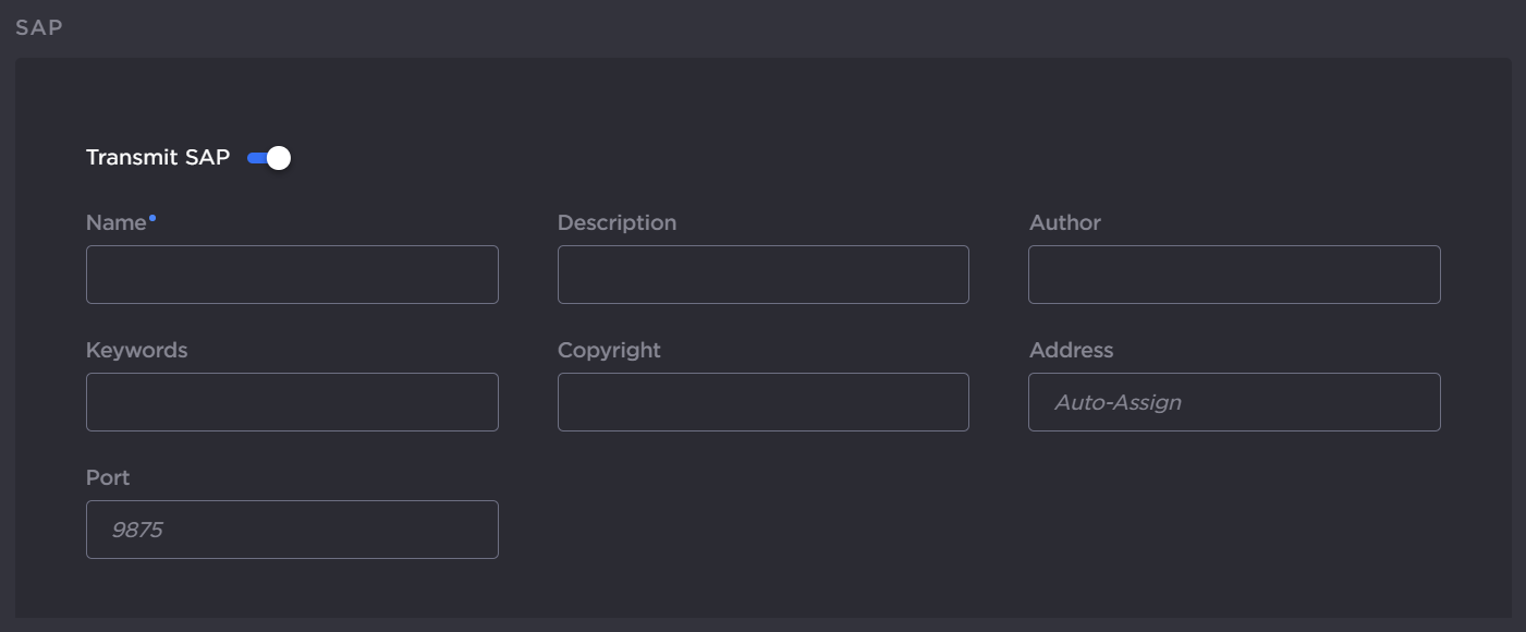 To configure SAP network announcements, toggle Transmit SAP on and fill in the SAP fields. For details, see Session Announcement Protocol (SAP).