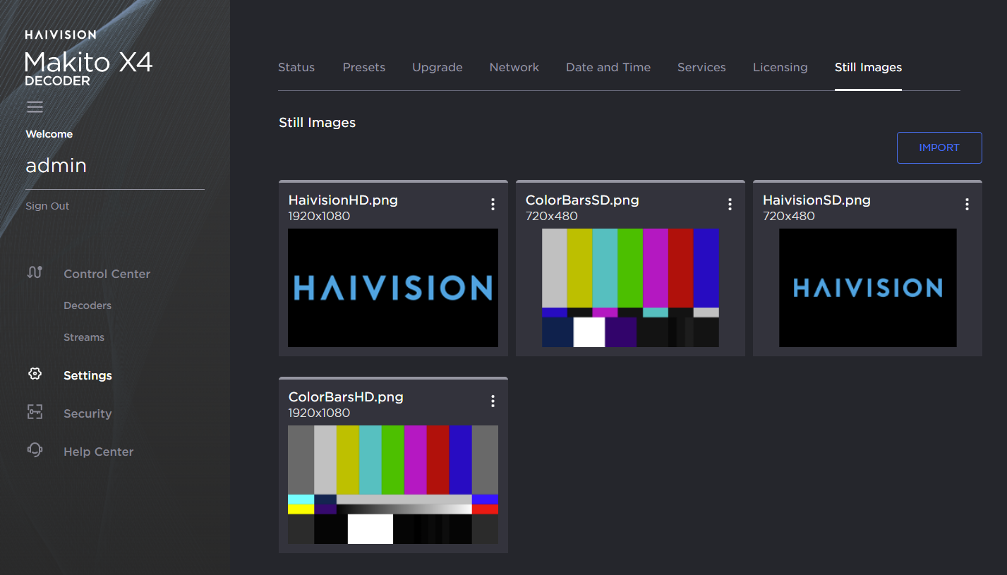 From the Still Images page, you can manage the collection of custom static images that the decoder can display when there is no input stream present. Once uploaded, the custom still image can be selected from the Decoder configuration panels. Each decoder channel can be configured to display a different custom Still Image.