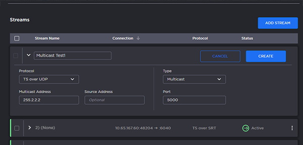 Select the stream Protocol, for example, TS over UDP. To configure TS over SRT streams, see Configuring Secure Reliable Transport (SRT).