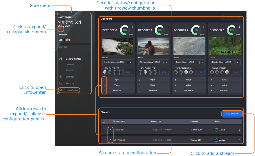 The Web interface opens to the Control Center, as shown in the following example. Your account information is displayed in the side menu. You can create streams and configure the decoders all on one page. Preview Thumbnails in the Decoder configuration panels provide a visual reference of each video decoder’s output.