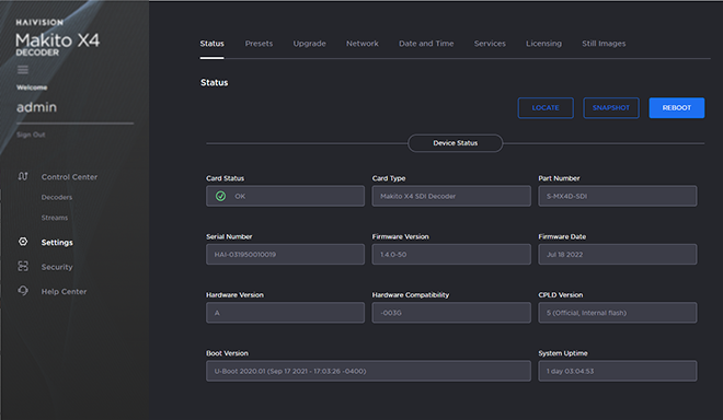 From the Status page, you can view status information about the Makito X4 decoder, such as the operating system uptime, along with information about the hardware and software components. You can also initiate blinking of the Status and TX LEDs (to help locate particular decoders in a lab or rack), as well as take a system snapshot and reboot the decoder.