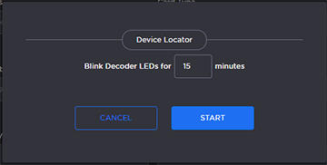 To initiate blinking of the Status and TX LEDs, click Locate. On the Device Locator dialog, adjust the time allowed to blink the decoder LEDs and click Start.