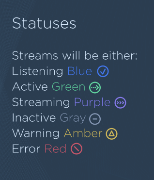 The new stream is active and is added to the Streams List. The stream status indicators are as follows: