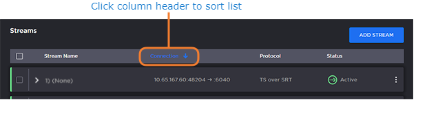 To sort the streams in the list by Stream Name, Connections, Protocol, or Status, simply click the column header to sort the list by. Clicking again changes the sort order from ascending to descending and vice versa.