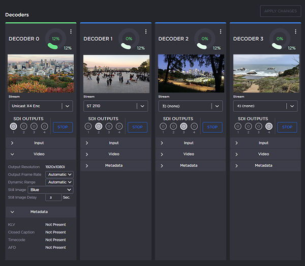 (Where applicable) Click the arrow () to expand or collapse the Decoders or Streams configuration panels. The following example shows the Decoder 0 Input, Video and Metadata configuration panels expanded.