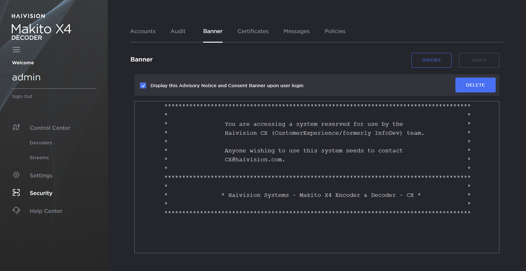 From the Banner page, administrators can upload a text file for the Advisory and Consent Banner. The banner is typically an advisory/warning notice to be displayed before the Sign-in page.