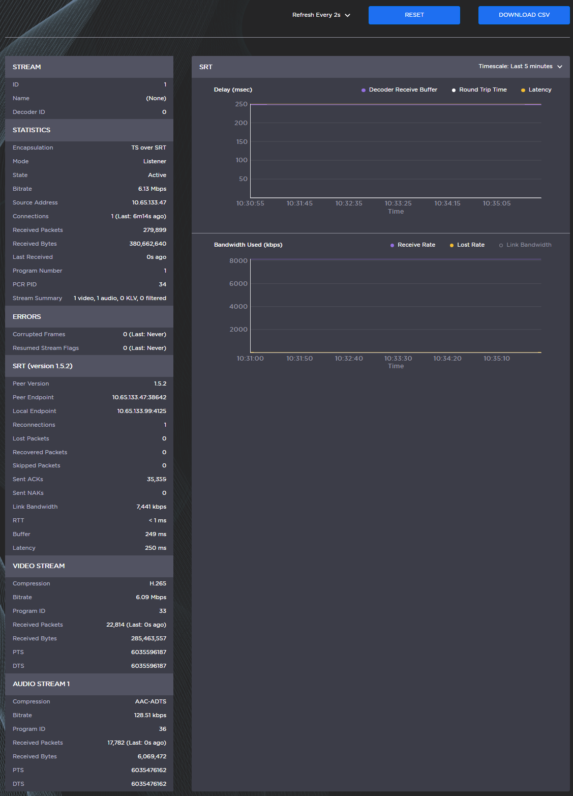 SRT streams include a graphical statistics display as shown in the following example: