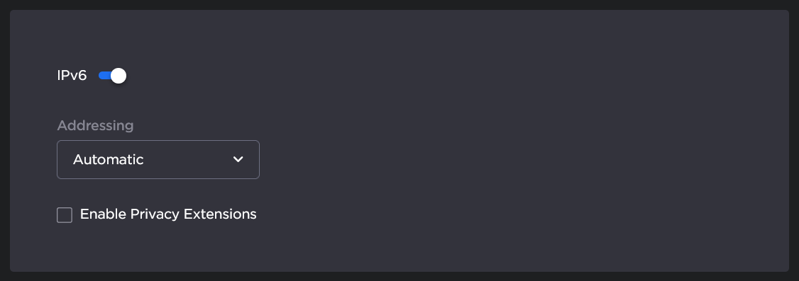 To configure IPv6 addressing, toggle the IPv6 button to On and select the Addressing option. Enter the new value(s) as required.