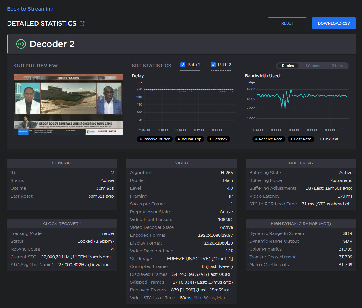 Click the Statistics icon to see how the SRT streams are performing. The following example shows the graphical statistics display for redundant transport streams:
