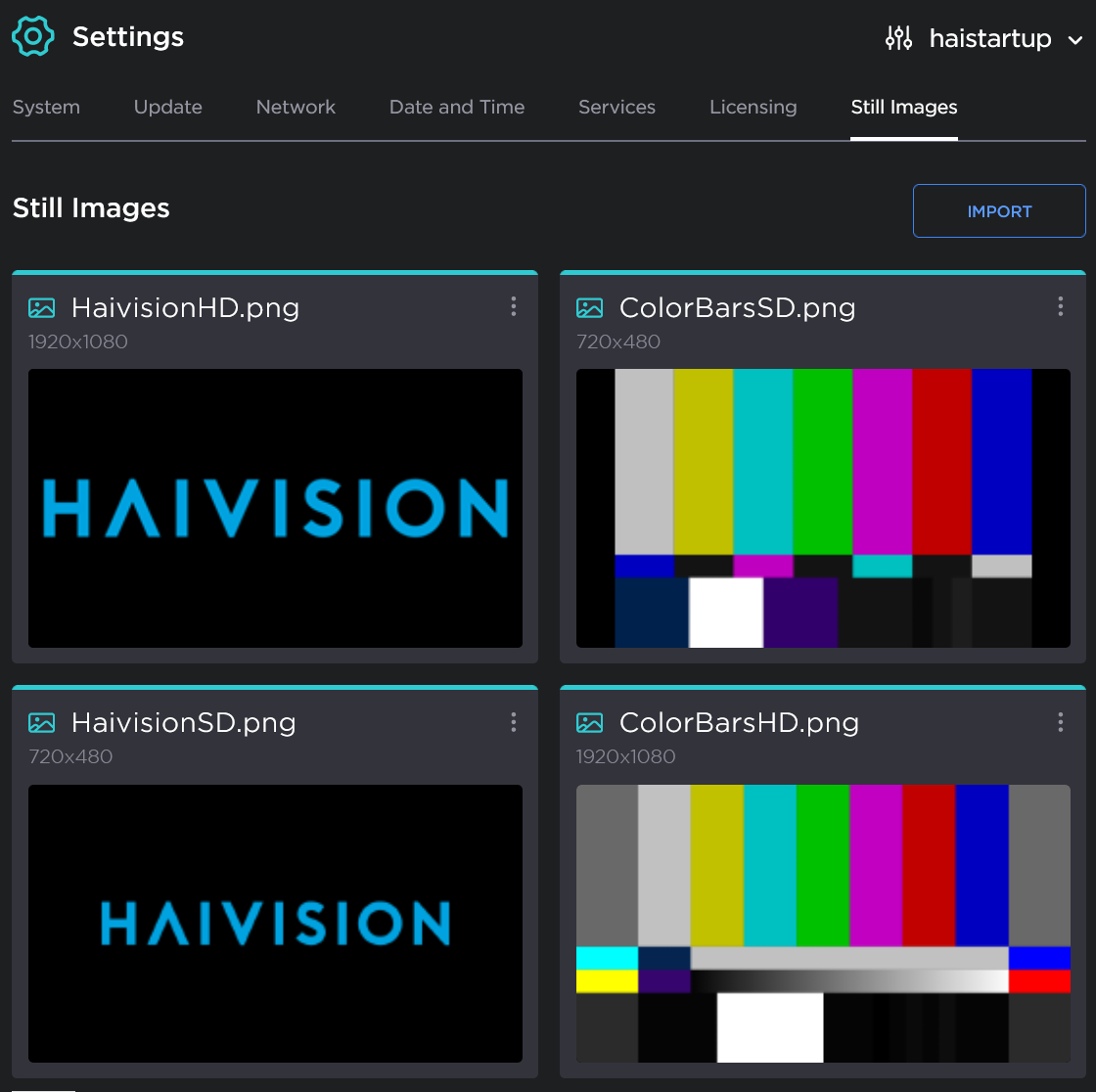 From the Still Images page, you can manage the collection of custom static images that the decoder can display when there is no input stream present. Once uploaded, the custom still image can be selected from the Decoder configuration panels. Each decoder channel can be configured to display a different custom Still Image.