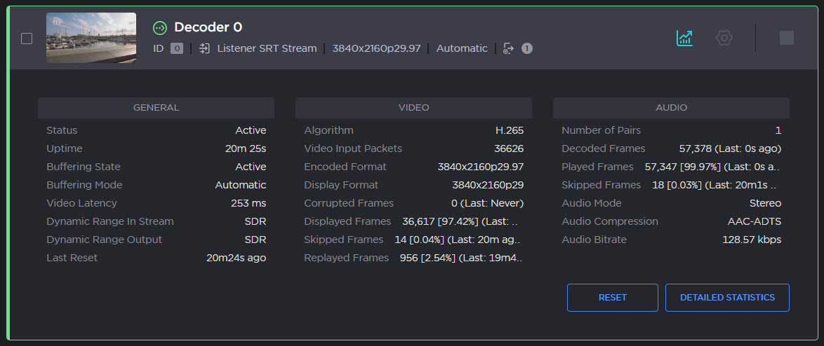 Scroll down to view all statistics, including Decoder Audio, Stream, and Stream Audio statistics.