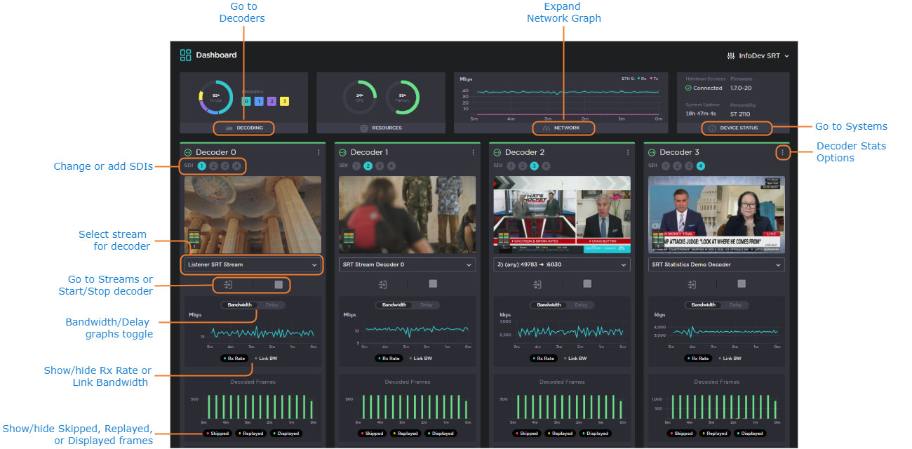 The dashboard provides visual references to quickly asses the decoding, resource, and network states. It also displays essential device status information, including: service connection, the unit's serial number, system uptime, and firmware version. For more information, see Navigating the Dashboard.