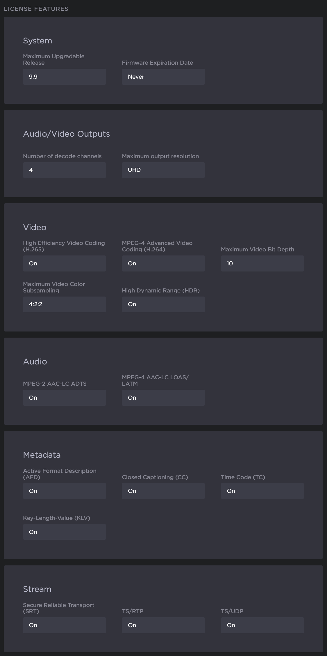 Scroll down to view the associated license features, including System, Audio/Video Outputs, Video, Audio, Metadata, and Stream capabilities.