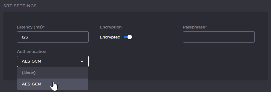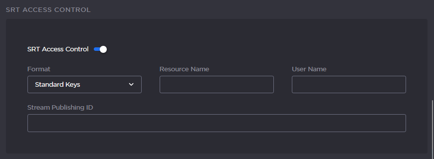 Setting the authentication to Auto allows the Listener to accept Callers with authentication set to either None or AES-GCM. Listeners with the authentication set to AES-GCM will only accept Callers which are also set to AES-GCM.When applicable, turn on the SRT Access Control toggle and fill in the necessary parameters. See Configuring SRT Access Control.