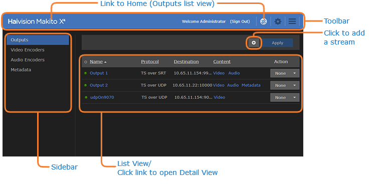 For security purposes, be sure to change the default passwords! See Changing Your Password (in the User's Guide).The Web interface opens to the Outputs List View.