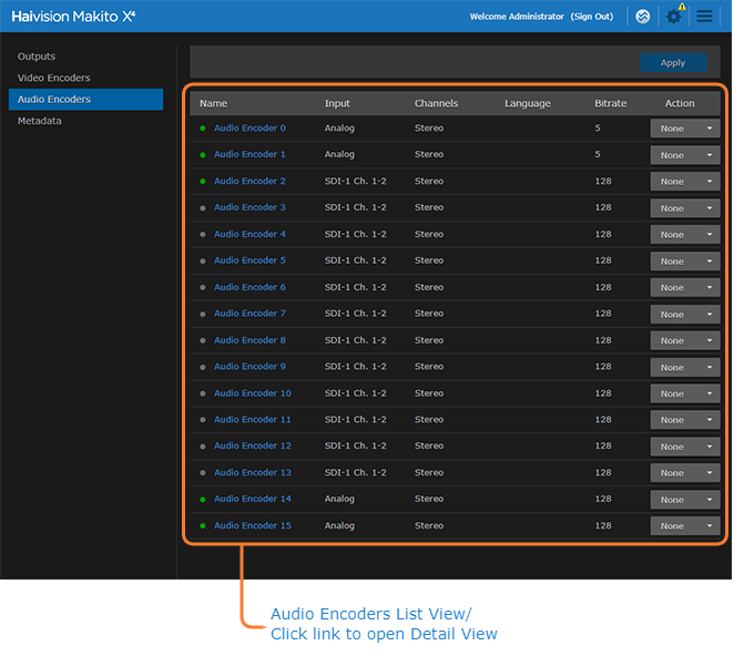 - To view details or modify the audio settings for an encoder, click a link in the table to open the Audio Encoder Detail View.
