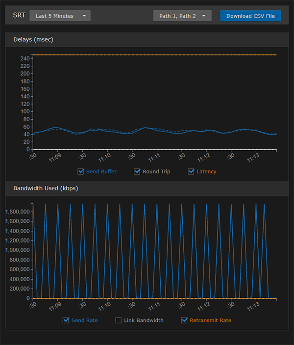 You can select which path to display, or both, from the Path 1, Path 2 drop-down. The CSV file merges both paths.