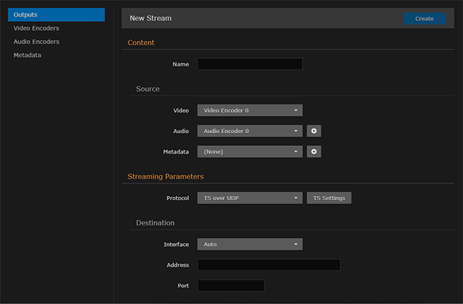 For a basic MPEG-2 transport stream setup, under Broadcasting, select TS over UDP as the Protocol (keeping the default TS settings).