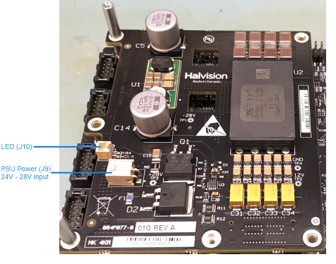Connect the 24VDC Haivision power supply to PSU J9. (Haivision p/n 750-014-01: Makito X4 Rugged Appliance bench power supply +24VDC / 40 W with mating power connector from 90-240 VAC)