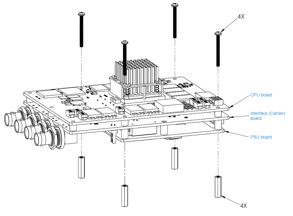 Connect the CPU, Interface (Carrier) and PSU boards, using four (4) screws and standoffs (provided).