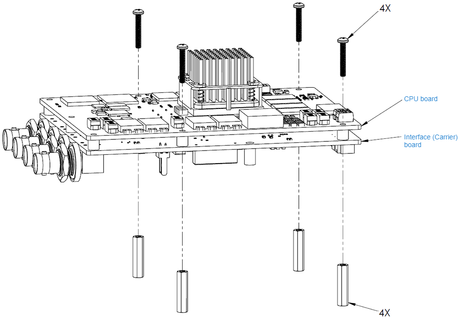 Connect the CPU and Interface (Carrier) boards, using four (4) screws and standoffs (provided).