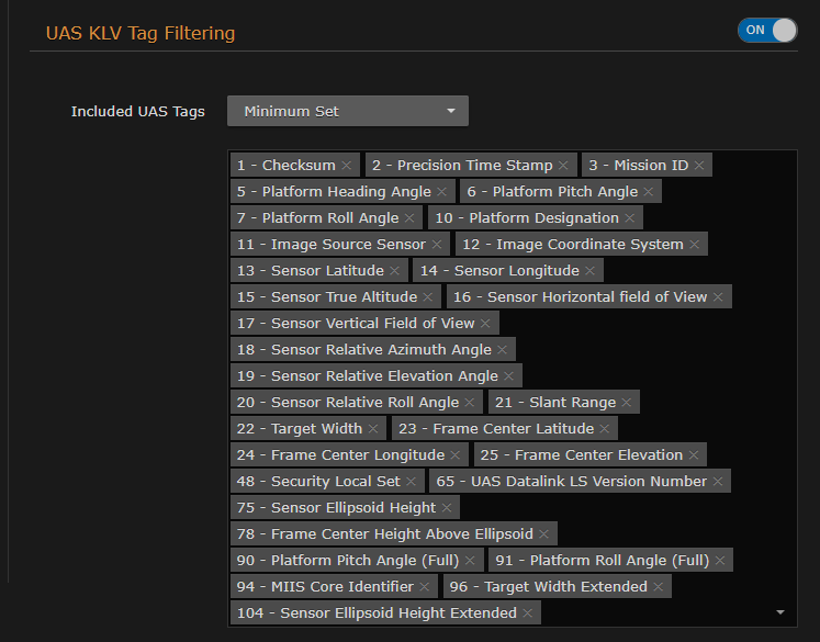 - On the Metadata Detail View, to filter MISB 0601 metadata tags, toggle the UAS KLV Tag Filtering button to On and select the scope of filtering from the Included UAS Tags drop-down list.