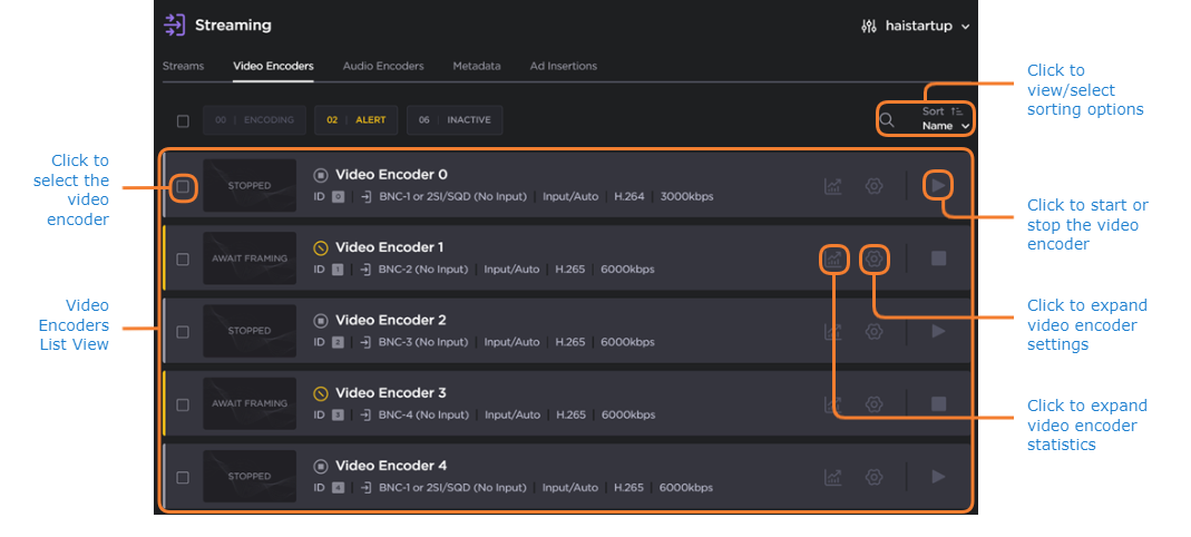 Click Streaming on the sidebar, and select theVideo Encoderstab. The Video Encoders List View opens. The Video Encoders List View displays the status, Name, Input format, Resolution, Codec (Algorithm), and Bitrate for each video encoder.