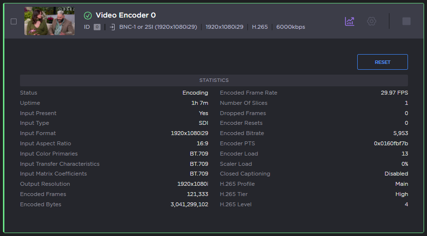 To view statistics for the encoder, click the Statistics icon . For details, see Video Encoder Statistics.
