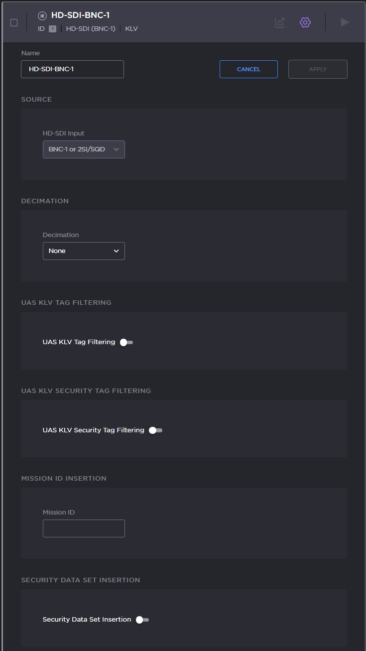 You can also create additional HD-SDI or ST-2110 sources linked to the same video input which can be configured to different decimation settings (as well as security reclassification and mission ID override). For example, you can have one high bitrate stream sending out all the KLV as well as a lower bitrate stream that uses KLV decimation.