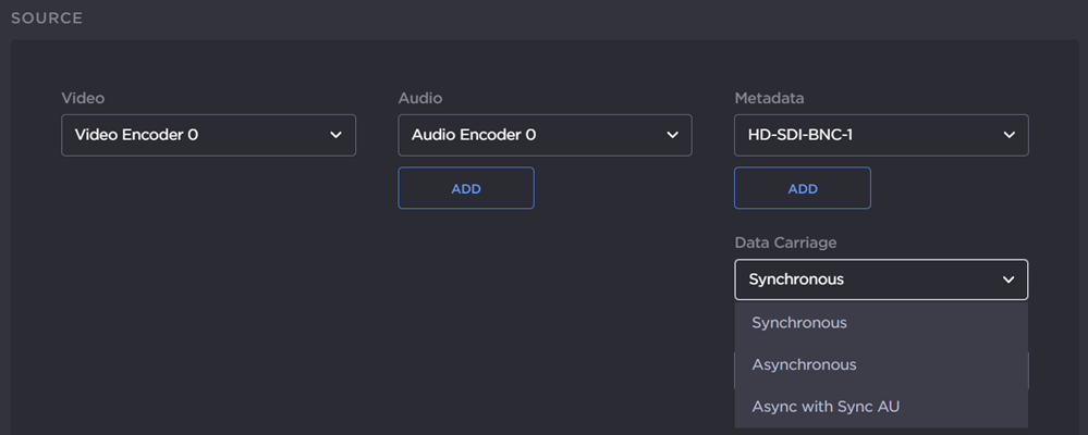 To add metadata to the stream, select the Metadata source, and (optionally) select the encapsulation type (Data Carriage).