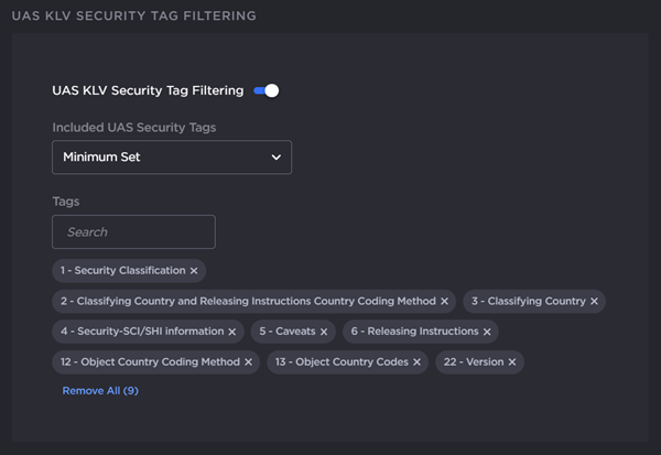 (UAS KLV Tag Filtering must be on) From the Metadata Detail View, toggle UAS KLV Security Tag Filtering on and select the scope of filtering from the Included Security Tags drop-down list.