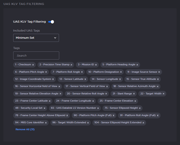On the Metadata Detail View, to filter MISB 0601 metadata tags, toggle UAS KLV Tag Filtering on, and select the scope of filtering from the Included UAS Tags drop-down list.