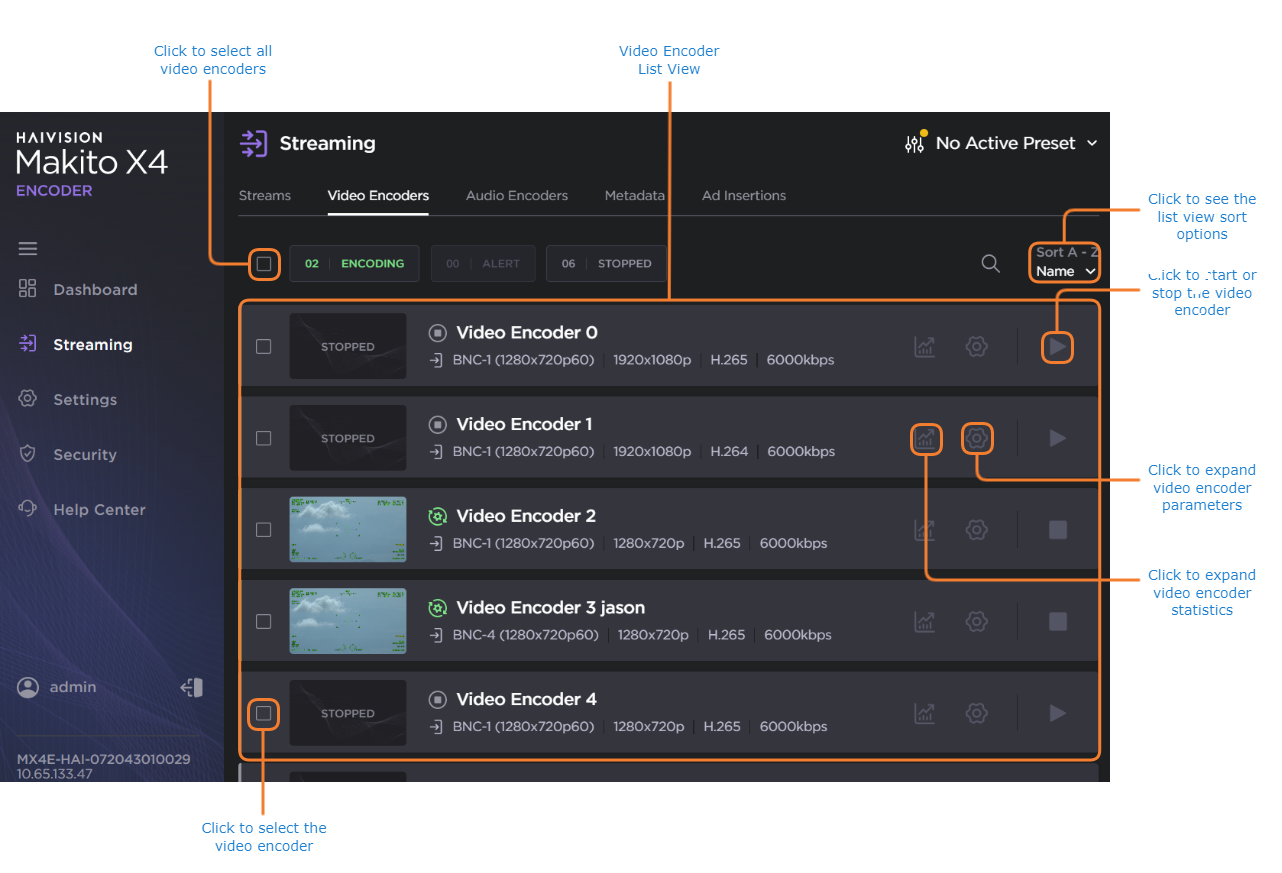 Click the Sort A-Z dropdown menu to view the sorting options. The video encoder list view can be sorted in Ascending or Descending order, or by: