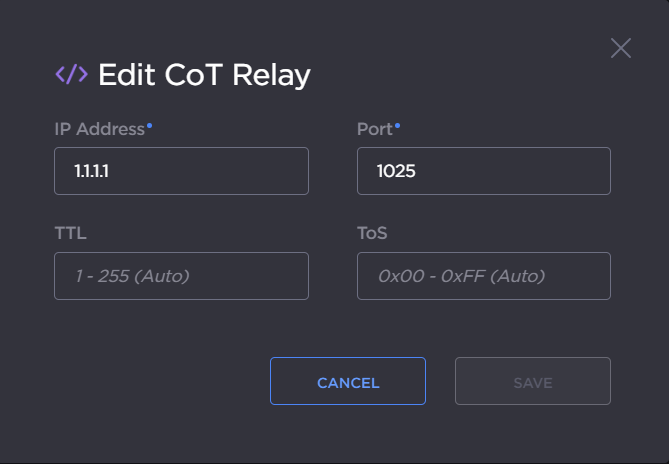 On the Add CoT Relay dialog, enter the IP Address and Port for the destination. Adjust the TTL and TOS values if required.