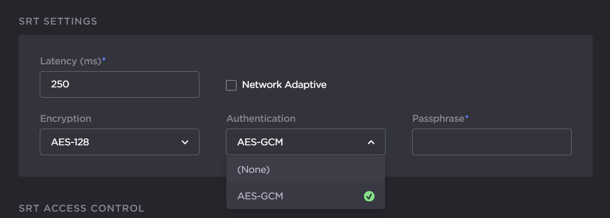 Toggle SRT Access Control on, and fill out the Destination parameters, SRT Settings, and SRT Access Control parameters.