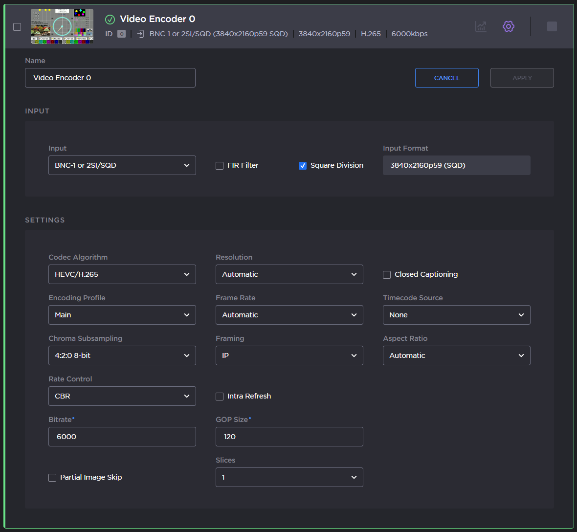 Click the Settings icon on video encoder 0 to expand the Video Encoder details.