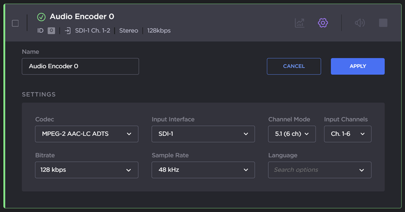 To connect this audio encoder to a stream, see Setting Up Streams.