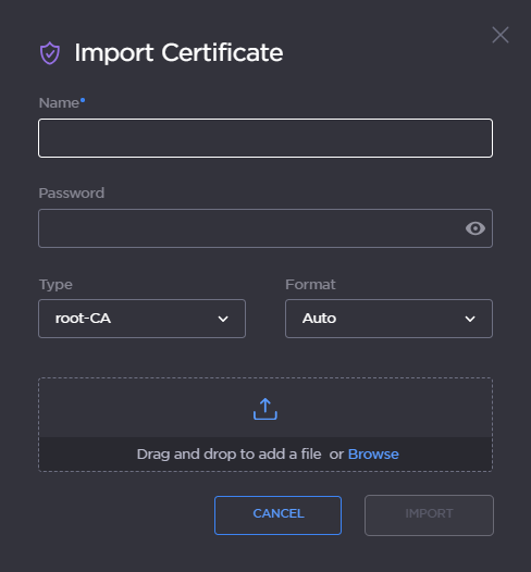 - On the Import Certificate dialog, type in the Name and complete the remaining fields. See "Import Identity or CA Certificate dialog" in Certificate Settings.