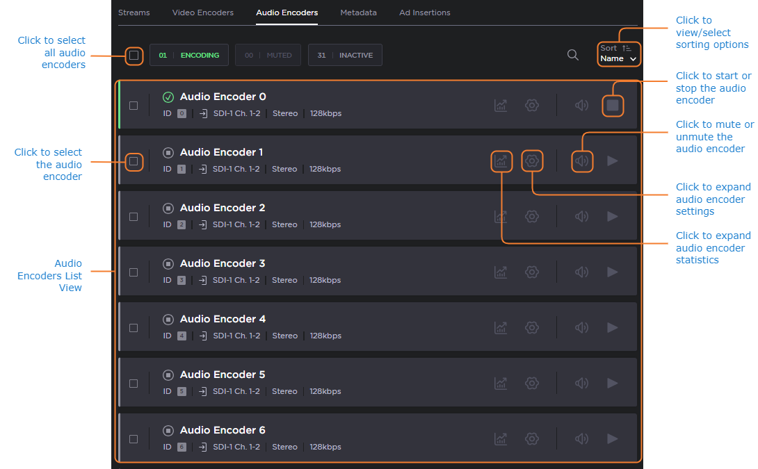 The Audio Encoders List View displays the Status, Name, Input, Channel Mode, Language, and Bitrate for each audio encoder.From here, you can perform the following tasks: