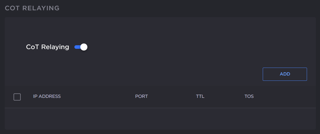 4. On the Add CoT Relay dialog, enter the IP Address and Port for the destination. Adjust the TTL and TOS values if required.