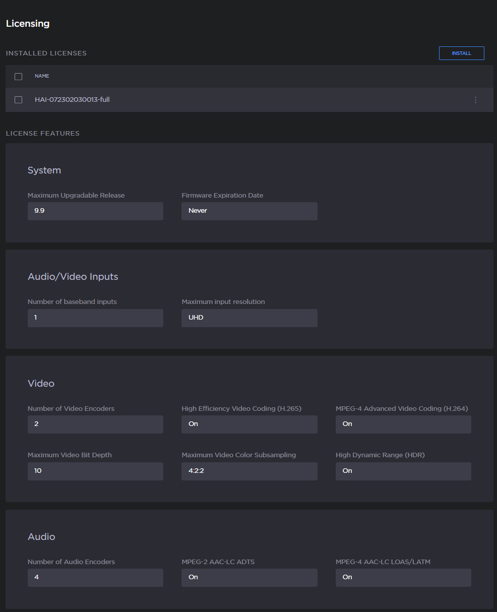 The System values show the version limit (Maximum Upgradable Release) and Expiration Date for the current license. The encoder will block installation of firmware versions that are above the Maximum Upgradable Release version. The unit will remain functional as long as it has not reached the Expiration Date. To obtain an updated license, please contact Sales@haivision.com.
