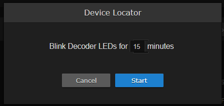 To initiate blinking of the Status and RX leds, click Locate. On the Device Locator dialog, adjust the time allowed to blink the decoder LEDs and click Start.