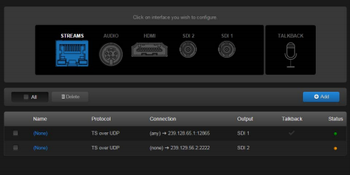 To return to the Streams List View, click the (Back) button. The stream you have created is added to the list. The following example shows the List View after a stream has been created, but not yet bound to output interfaces. (Audio Talkback is available but not enabled.) After streams have been bound to the SDI 1 and SDI 2 output interfaces (see Configuring Decoder Outputs), the outputs will be listed.