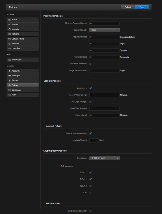 From the Policies page, administrators can set policies for passwords, session timeout, cryptographic strength, and other security criteria for Makito X user accounts. These policies will apply to all user accounts; therefore, it is recommended to set the policies before beginning to create accounts.