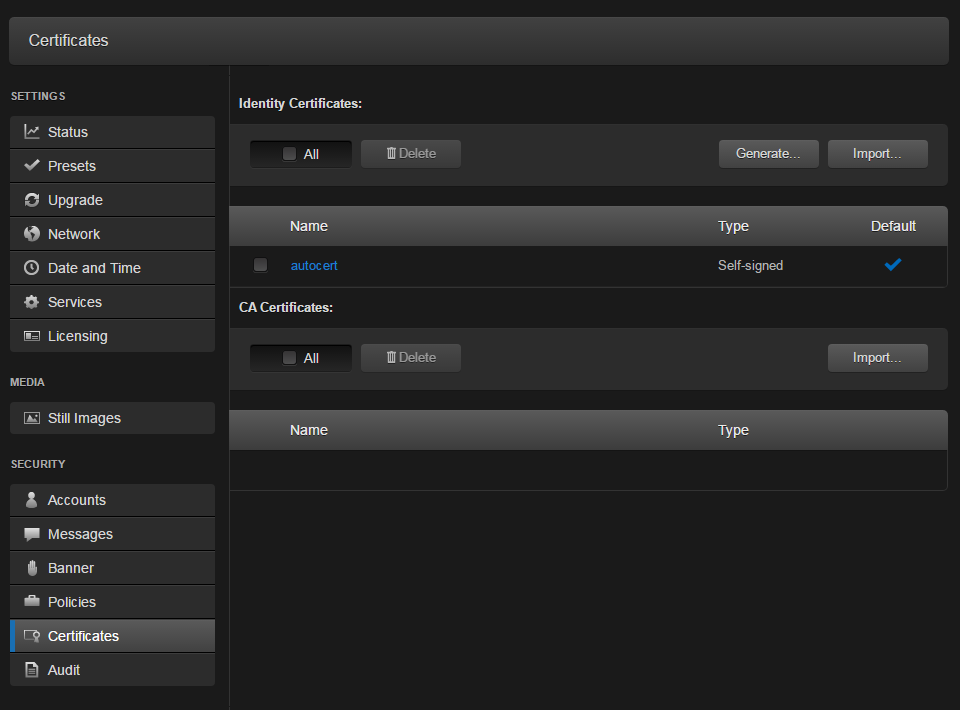 From the Certificates page, you can generate, import, view, and delete Identity Certificates, as well as select the default Identity Certificate. You can also import, view, and delete CA Certificates.