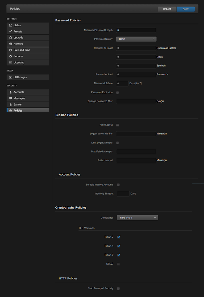 From the Policies page, administrators can set policies for passwords, session timeout, cryptographic strength, and other security criteria for Makito X user accounts. These policies will apply to all user accounts; therefore, it is recommended to set the policies before beginning to create accounts.