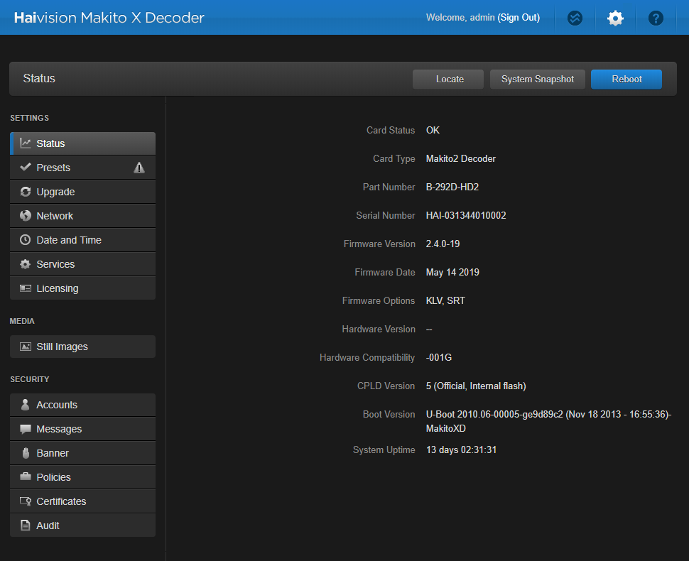 From the Status page, you can view status information about the Makito X, such as the operating system up time, along with information about the hardware and software components. You can also initiate blinking of the Status and RX LEDs (to help locate particular decoders in a lab or rack), as well as take a system snapshot and reboot the decoder.